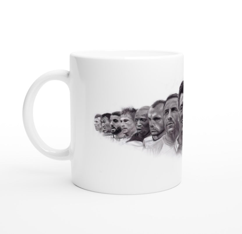 My drawing of 15 Fulham Legends printed on to an 11oz ceramic mug.